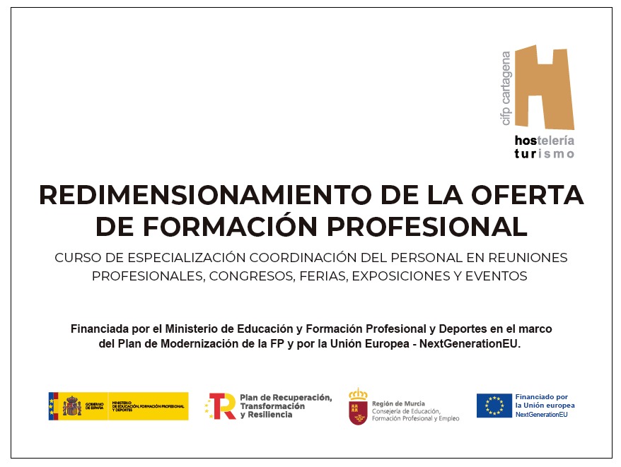 El CIFP de Hostelería y Turismo de Cartagena, ha sido partícipe de la actuación «Redimensionamiento de la oferta de Formación Profesional», en su curso de especialización «Coordinación del personal en reuniones profesionales, congresos, ferias, exposiciones y eventos».